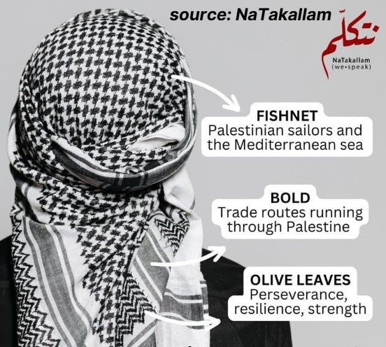 Palestinian symbols such as the keffiyeh, olive tree, key, and watermelon carry deep cultural and political significance, reflecting the Palestinian experience of identity and connection to the land.