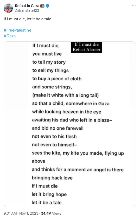 Refaat Alareer was another renowned Palestinian writer, poet, and professor. He is known for his work that vividly portrays the Palestinian experience, particularly the resilience and struggles of those in Gaza as a Gazan himself. After weeks of receiving death threats from Israel, he was killed on December 6, 2023 in a targeted Israeli airstrike. Refaat’s brother and his son, as well as his sister with three of her children were among those killed in the same airstrike.