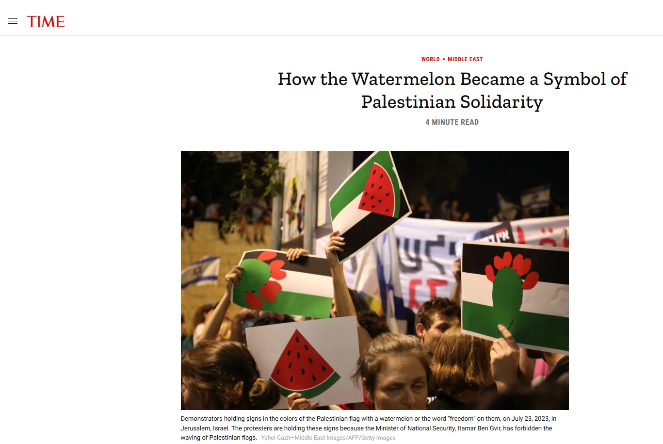 Eventually, Israel even started cracking down on the use of the watermelon. In Gaza, an international journalist recounts how the Israeli army arrested people for carrying sliced watermelons (see TIME article below).