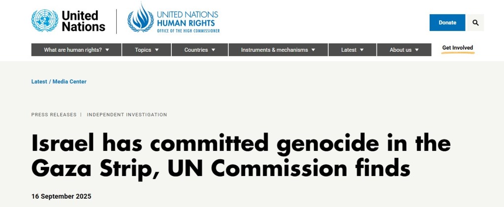 According to a report released September 16, 2025 by the UN Independent International Commission of Inquiry on the Occupied Palestinian Territory, including East Jerusalem, and Israel, Israel has committed genocide against Palestinians in the Gaza Strip. The Commission said it “urges Israel and all States to fulfil their legal obligations under international law to end the genocide and punish those responsible for it.”