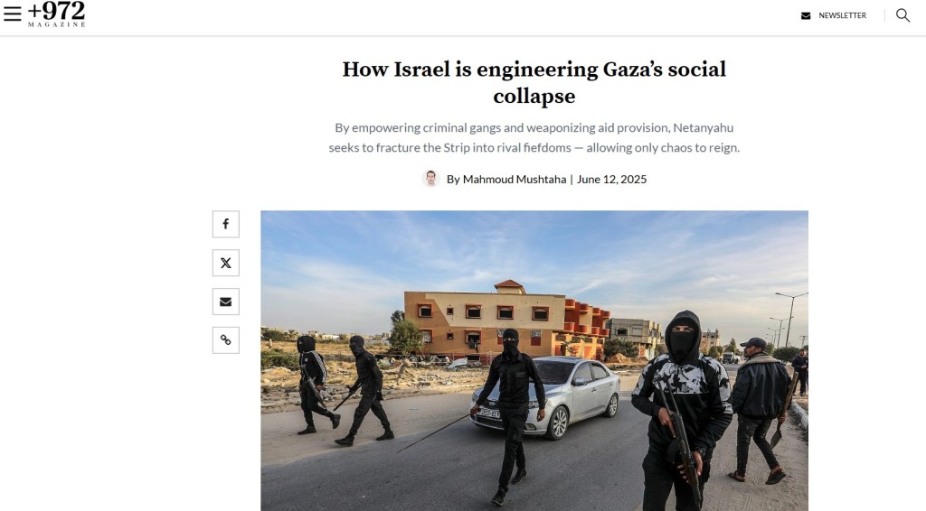 Israel is also backing and arming gangs in Gaza to rival Hamas. This includes a faction called the “Popular Forces” led by Yasser Abu Shabab, a Rafah-based militia leader. These groups are threatening to derail and destabilize Gaza. Abu Shabab’s group has taken control of parts of southern Gaza under the pretext of maintaining order and protecting aid convoys, but has been killing, looting and extorting Palestinians in collaboration with Israeli forces, and blaming/framing Hamas for its crimes.